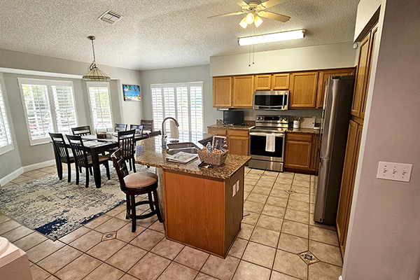 Your premier pool and golf course home vacation is waiting. This 3 bedroom, 2 bath POOL home in the Village of Palo Alto, sits on the #1 hole at Tierra Del Sol Championship golf course. Enjoy the sparkling pool and spacious, private outdoor area, all the while watching the golfers play. You and your family can relax in lounge chairs, or have a picnic in the private lanai area. Relax in the living room which sports a 65" smart TV. The primary bedroom has a comfortable king size bed and 50" smart TV. Plus of of the Primairy Bedroom, you have a small office. The 2nd and3rd bedrooms both have queen beds, chairs and dressers. Close to shopping, Golf, Tennis, Pickleball and many other activities. Includes internet and a Yamaha Golf Cart. Pricing varies depending on the time of year.