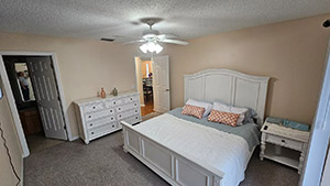 Step inside to discover bright living/dining area that seamlessly flows through a large sliding door to your private lanai and pool area. The kitchen is a chef’s delight with its upgraded white cabinetry and granite countertops. Retreat to the primary bedroom with king size bed, a generous walk-in closet and a sliding door that opens directly to the outdoor pool area. In addition to the primary suite, there are two additional bedrooms and a second bathroom, providing ample space for family or guests. The home also includes an indoor laundry area for added convenience. The expansive outdoor space is a true highlight, featuring a large pool surrounded by an expansive deck and birdcage, perfect for enjoying sunny Florida days. Other features include: neutral color scheme, attic stairs, inside laundry, whole home gutters, and more! The beautifully landscaped yard adds to the home's curb appeal and offers a serene setting for relaxation.